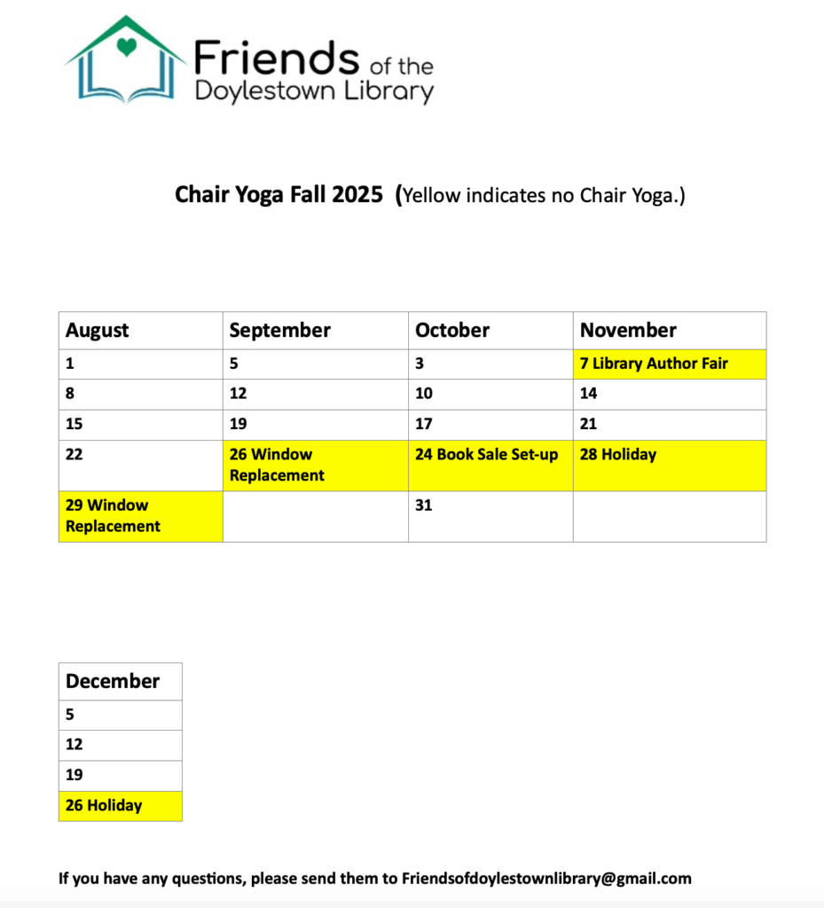 Free Chair Yoga Class every Friday at 9:30 a.m. at Doylestown Library. Looking for a Chair Yoga Practice you can do at home? Click Here For Our On-Demand Chair Yoga Video Class
